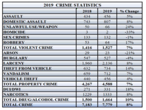 The total report revealed crime to be up by 8 percent but two categories – homicides and arson cases were down.