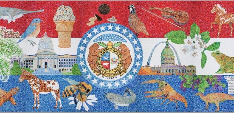 The large-scale mural was recently installed inside Harry’s Place Cafeteria, 4th floor of the Truman State Office Building, for the public to enjoy. The mural features 19 state symbols to commemorate Missouri’s 200 years of statehood.