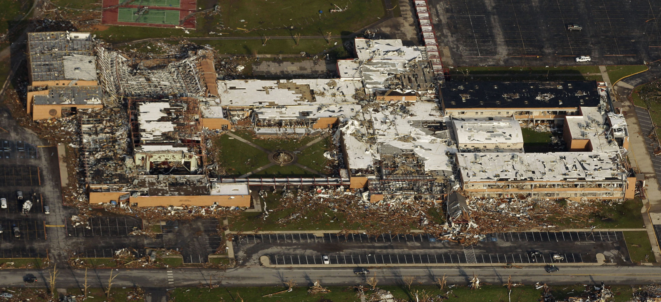 Cars litter the parking lot at the damaged St. John’s Regional Medical Center in Joplin, Mo., Monday, May 23, 2011. A large tornado moved through much of the city Sunday, damaging a hospital, hundreds of homes and businesses and killing at least 156 people. (AP Photo/Charlie Riedel)