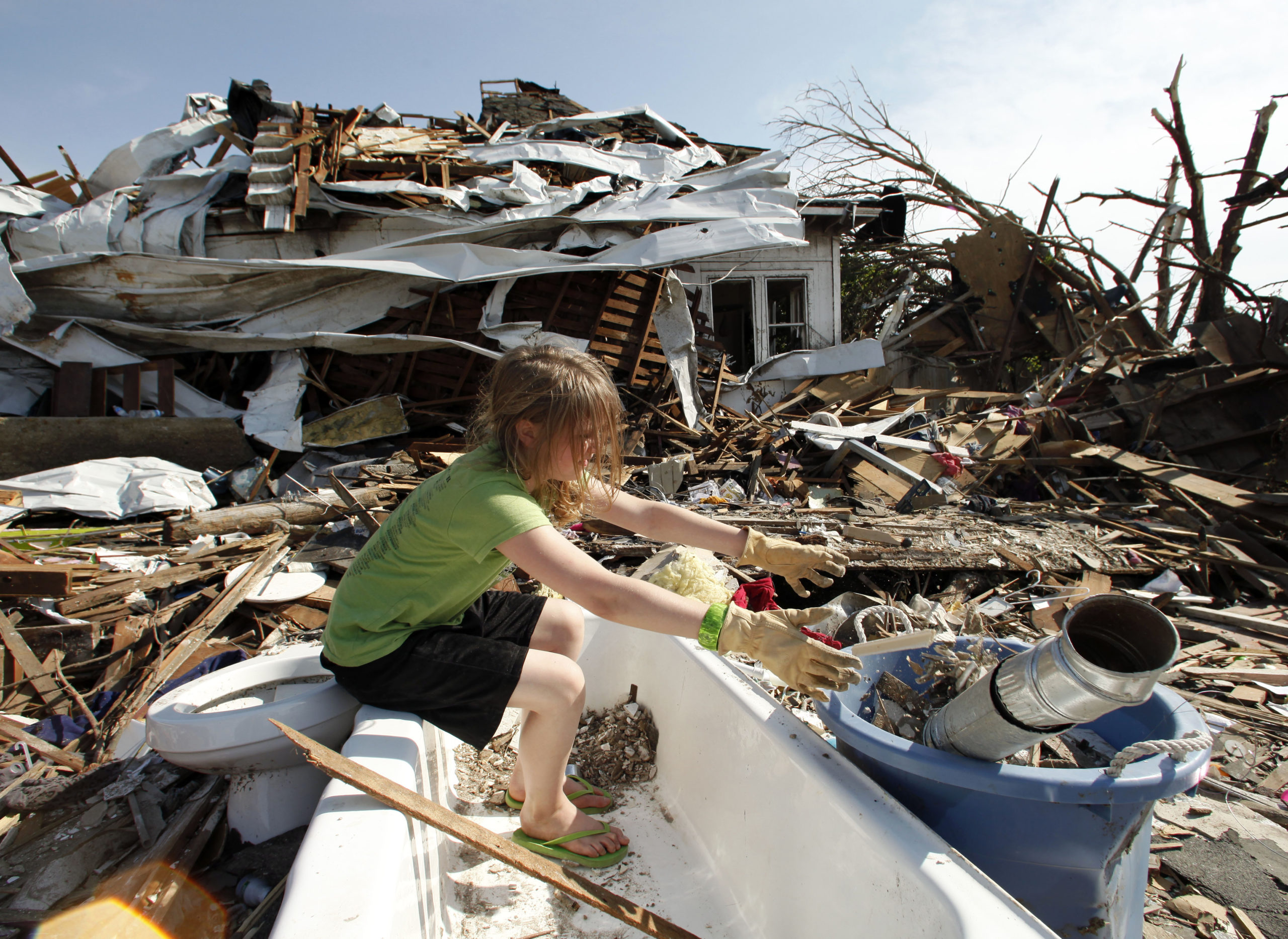 Laura Cobb, 11, cleans debris from a bathtub while helping with clean-up at her destroyed home in Joplin, Mo. Monday, May 30, 2011. Four members of her family escaped injury by seeking refuge in the tub when an EF-5 tornado tore through much of the city May 22, damaging a hospital and hundreds of homes and businesses and killing at least 139 people. (AP Photo/Charlie Riedel)
