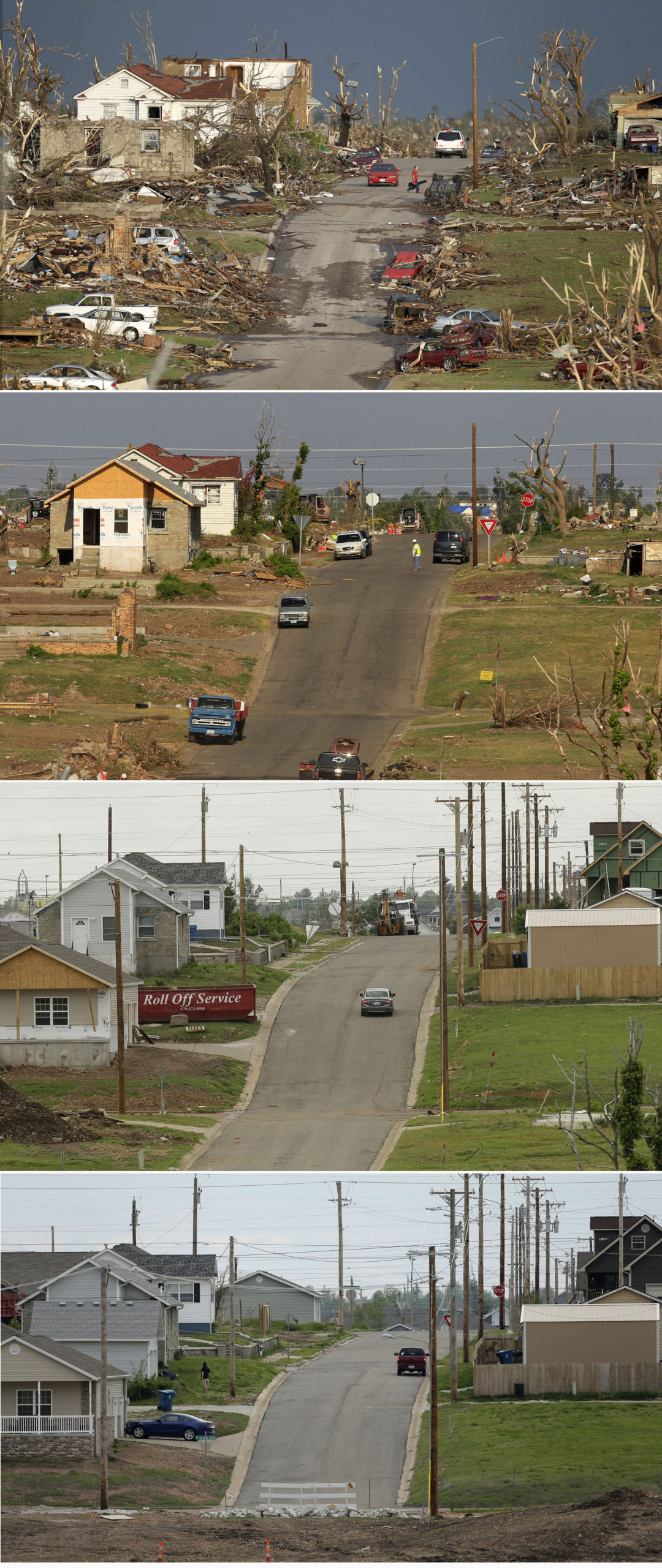 This four-photo combo shows a scene taken on May 23, 2011, top, July 21, 2011, May 7, 2012, and May 10, 2013, bottom, showing progress made in Joplin, Mo. in the two years after an EF-5 tornado destroyed a large swath of the city and killed 161 people. (AP Photo/Charlie Riedel)