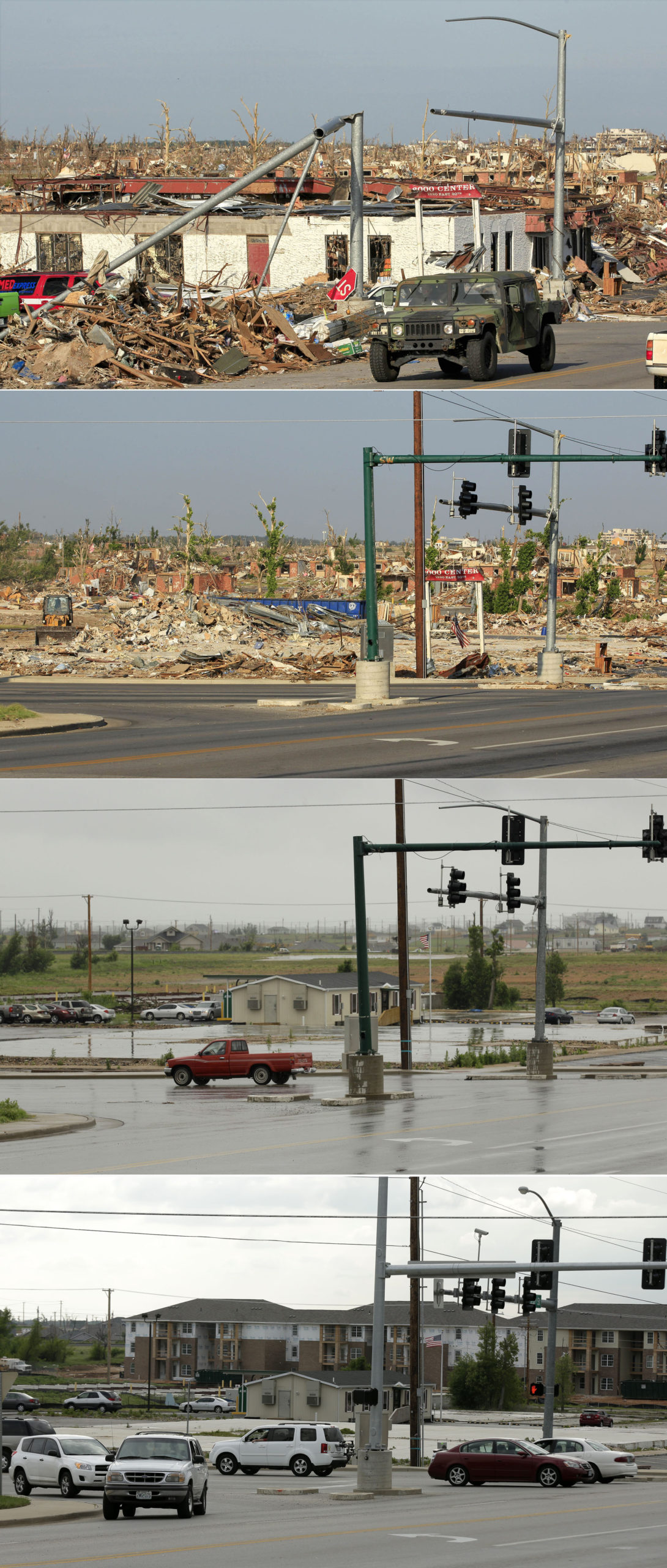This four-photo combo shows a scene taken on May 27, 2011, top, July 21, 2011, May 7, 2012 and May 10, 2013, bottom, showing progress made in Joplin, Mo. in the two years after an EF-5 tornado destroyed a large swath of the city and killed 161 people. (AP Photo/Charlie Riedel)