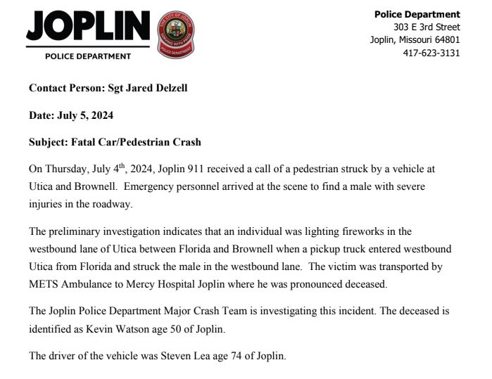 Joplin police say 50-year-old Kevin Watson was lighting fireworks in the westbound lane of Utica St. between Florida Ave. and Brownell Ave., when a pickup truck entered westbound Utica St. and hit him.