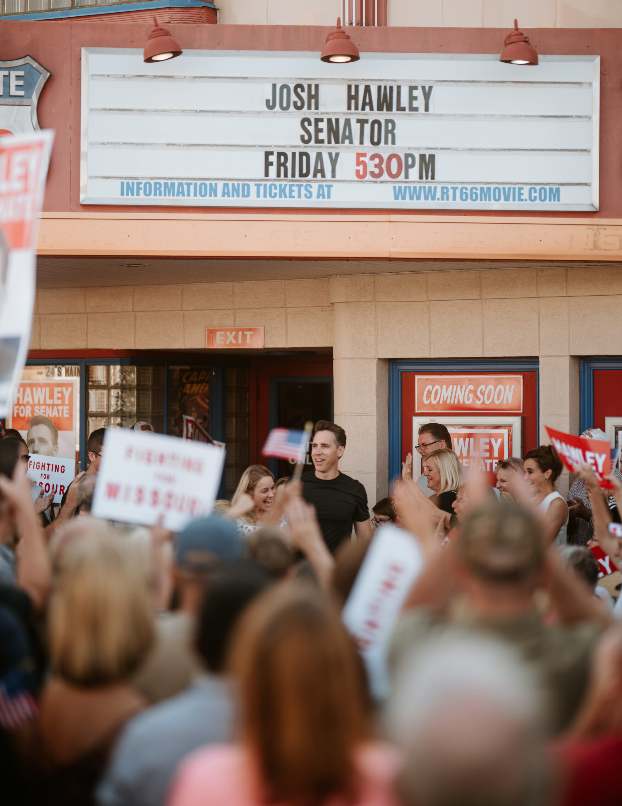 Hawley told a group of supporters at the Route 66 Movie Theater that it is time to “Take America Back.”