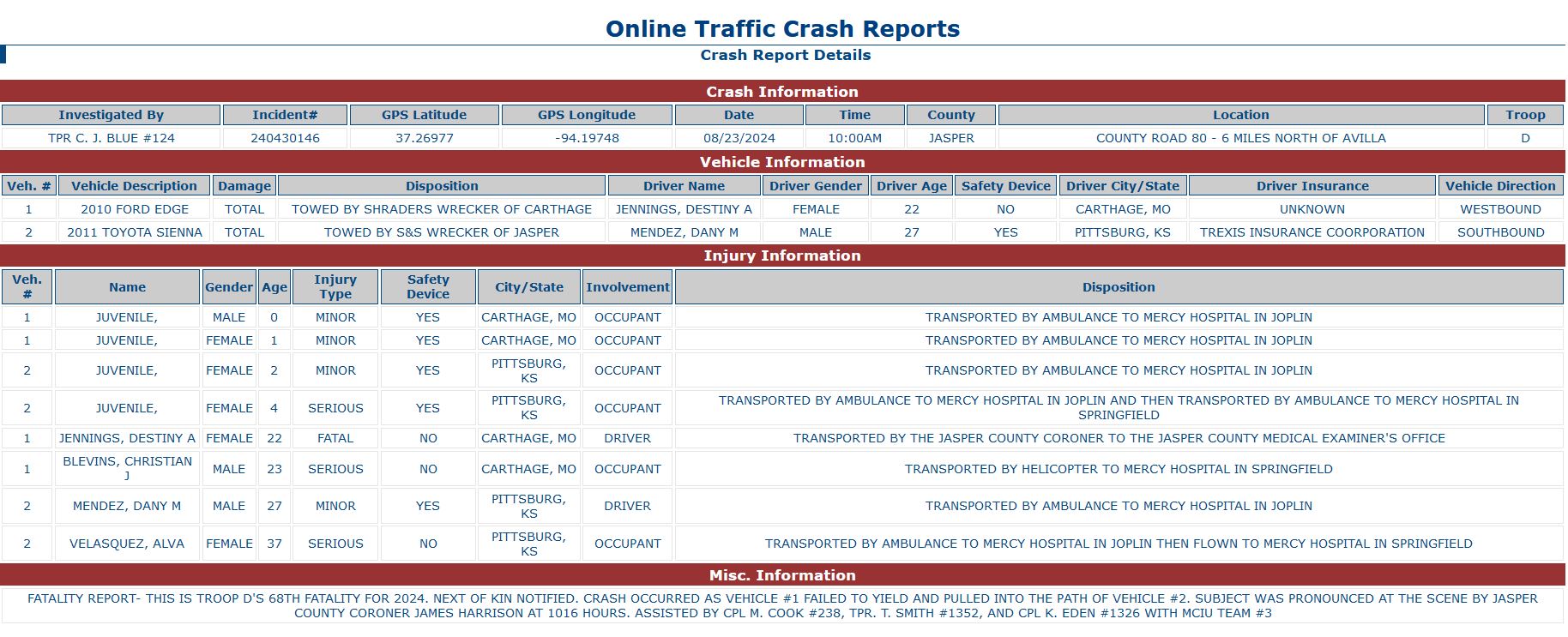 22-year-old Destiny A. Jennings was driving an SUV that reportedly failed to yield and pulled into the path of a minivan, which caused the violent collision.