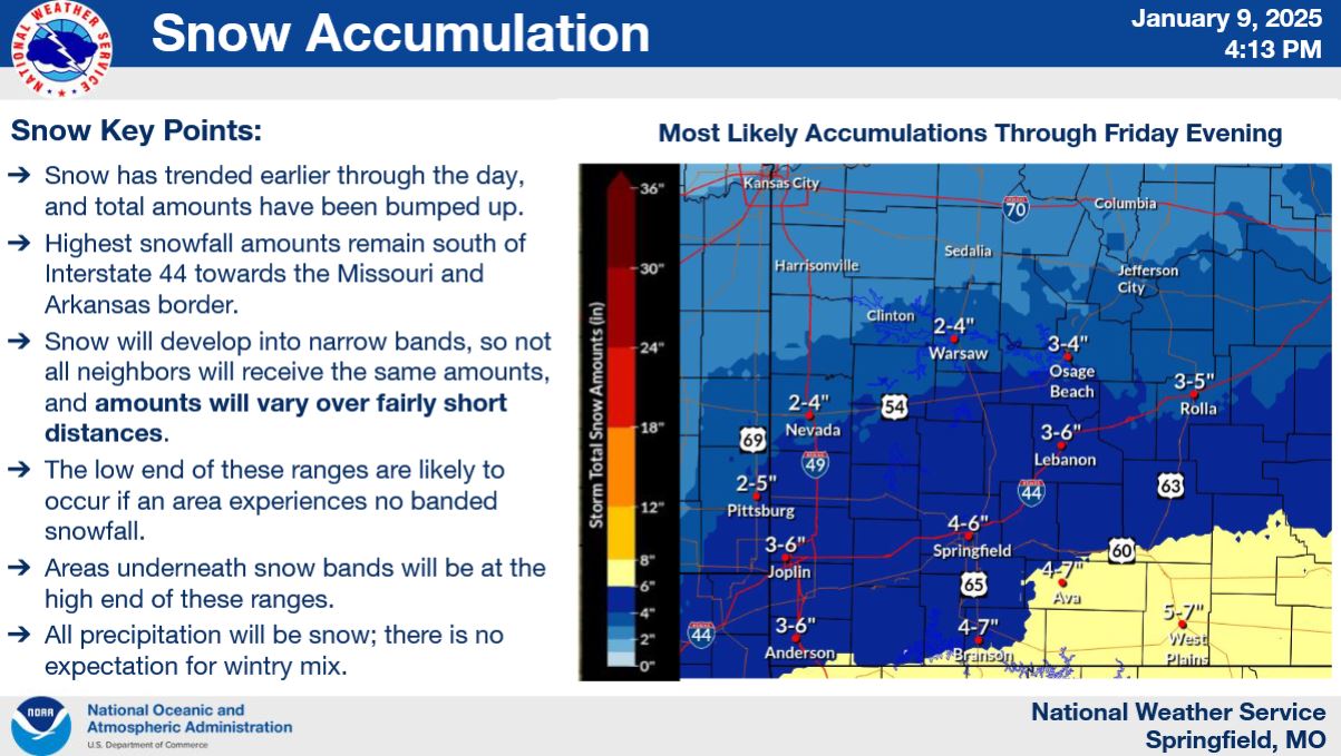 Highest snowfall amounts across southern Missouri. Generally 5 to 7 inches in the warning area and 3 to 4 inches in the advisory area.