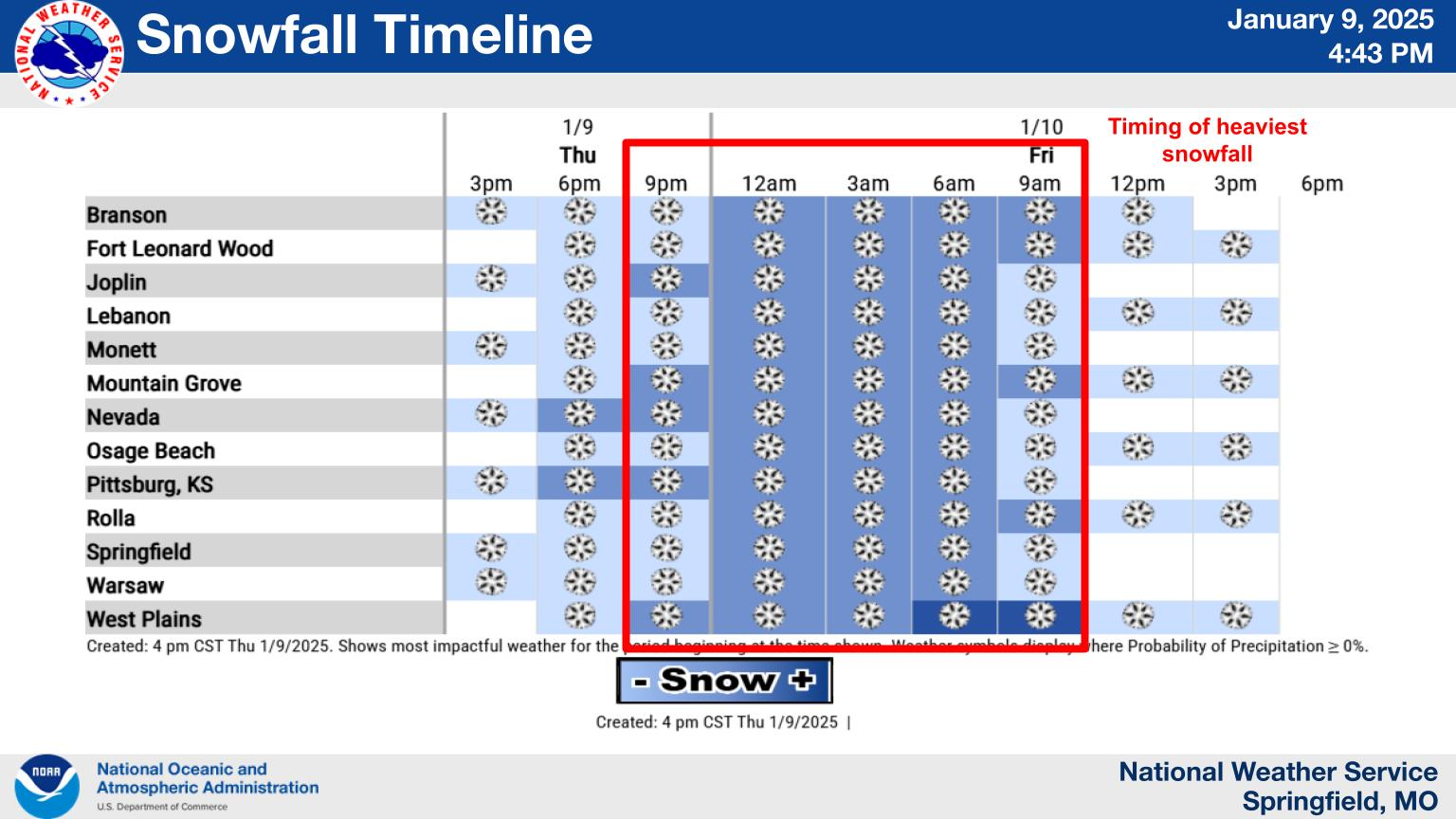 Snow will begin to accumulate this afternoon over southwest Missouri and southeast Kansas and then spread northeast into the remainder of the area this evening and tonight.