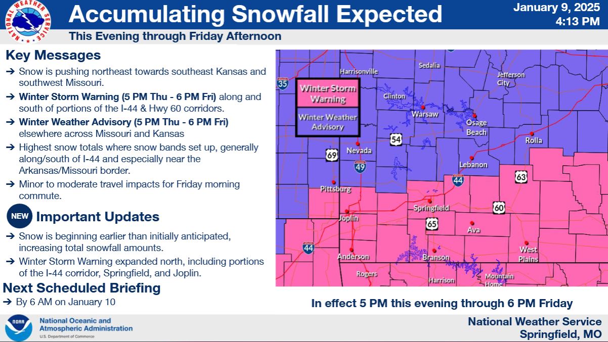 The National Weather Service in Springfield has issued a Winter Storm Warning for Joplin and other areas in the KZRG listening area from 5pm Thursday through 6PM Friday.