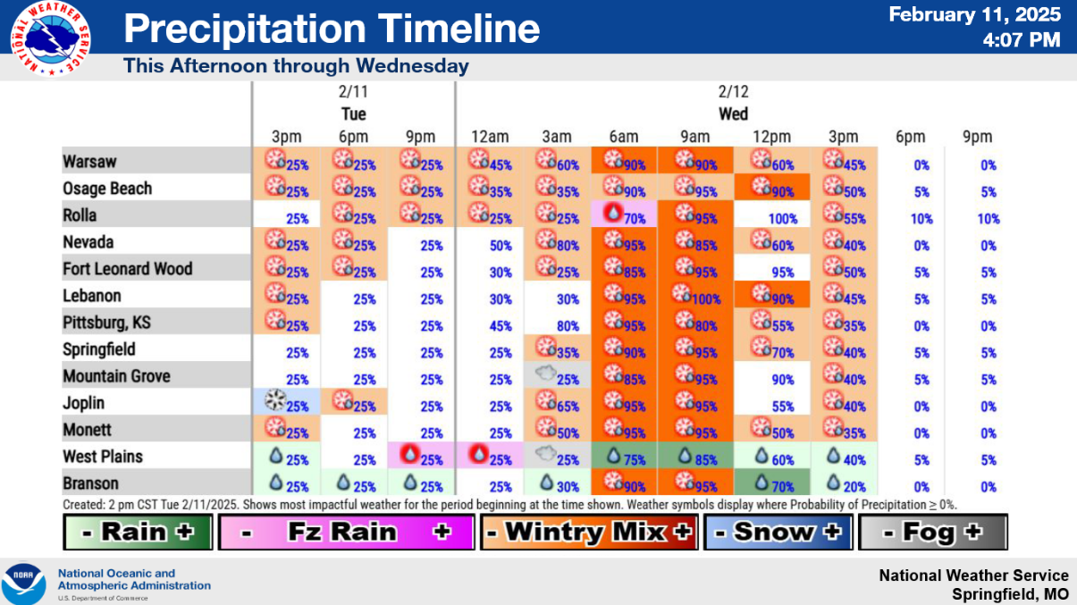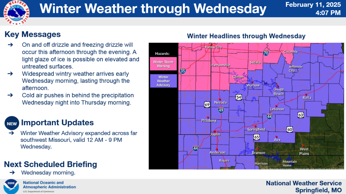 A Winter Weather Advisory is in effect NOW until 9 PM Wednesday night. Snow is most likely along and north of the Highway 54 corridor, bringing at least minor travel impacts to this area. Accumulations of 2 to 4 inches can be expected in west central Missouri. Around the I-44 corridor, a wintry mix including ice, sleet, snow, and rain is most likely. Some freezing drizzle will also be possible across portions of southern Missouri Wednesday afternoon. A glaze to a tenth of an inch of ice can be expected in the eastern Ozarks and along the I-44 corridor east of Highway 65.